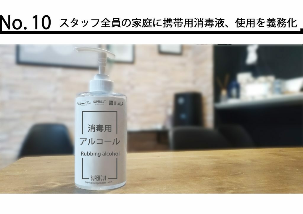 ・全スタッフへ「携帯用消毒液」を配布し休日プライベートでも使用を義務化しています。