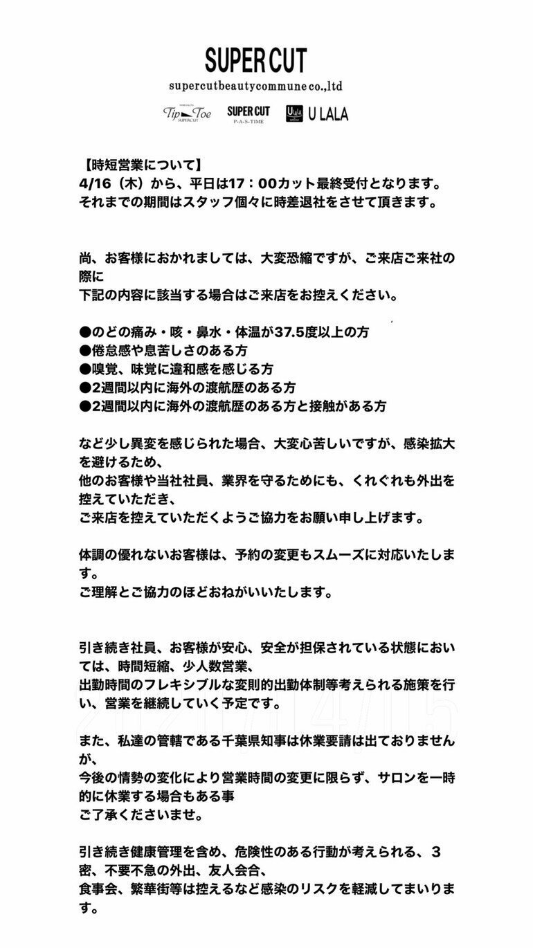 営業継続と時短営業のお知らせ - 八千代台の美容室 スーパーカット
