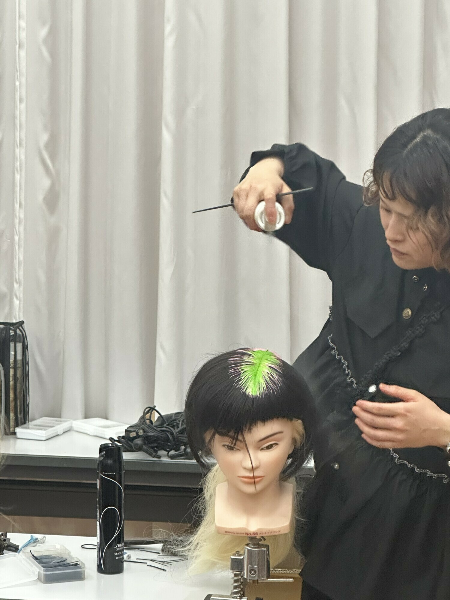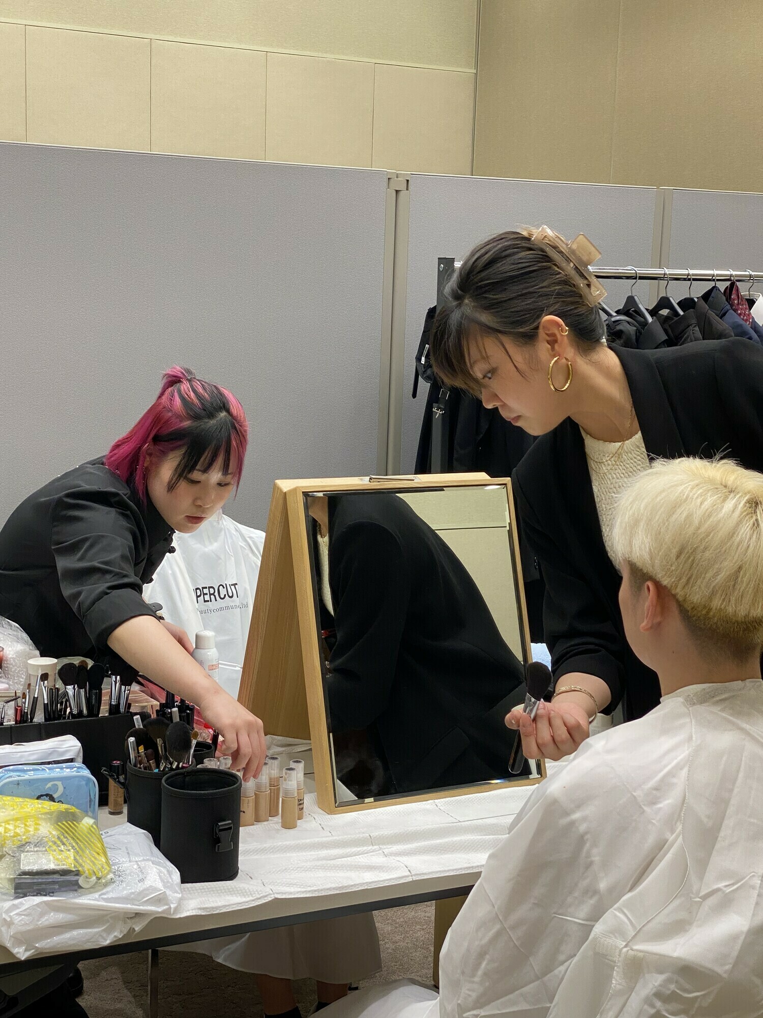 ヘアメイク授業❷大阪の高津理容美容専門学校はスタッフの多くの母校で万博開会ステージのヘアメイク展示
