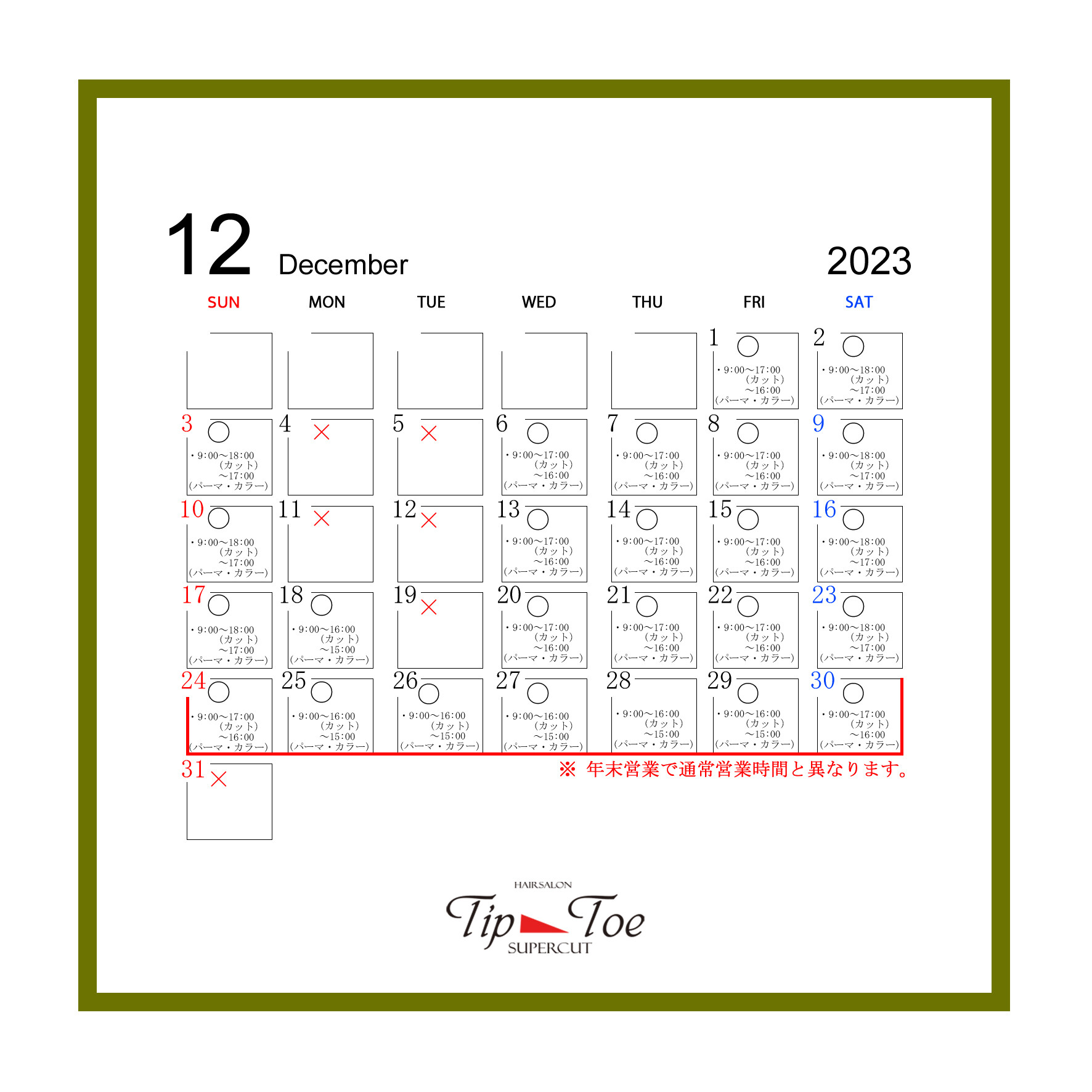 Tip&Toe 年末営業時間のお知らせ