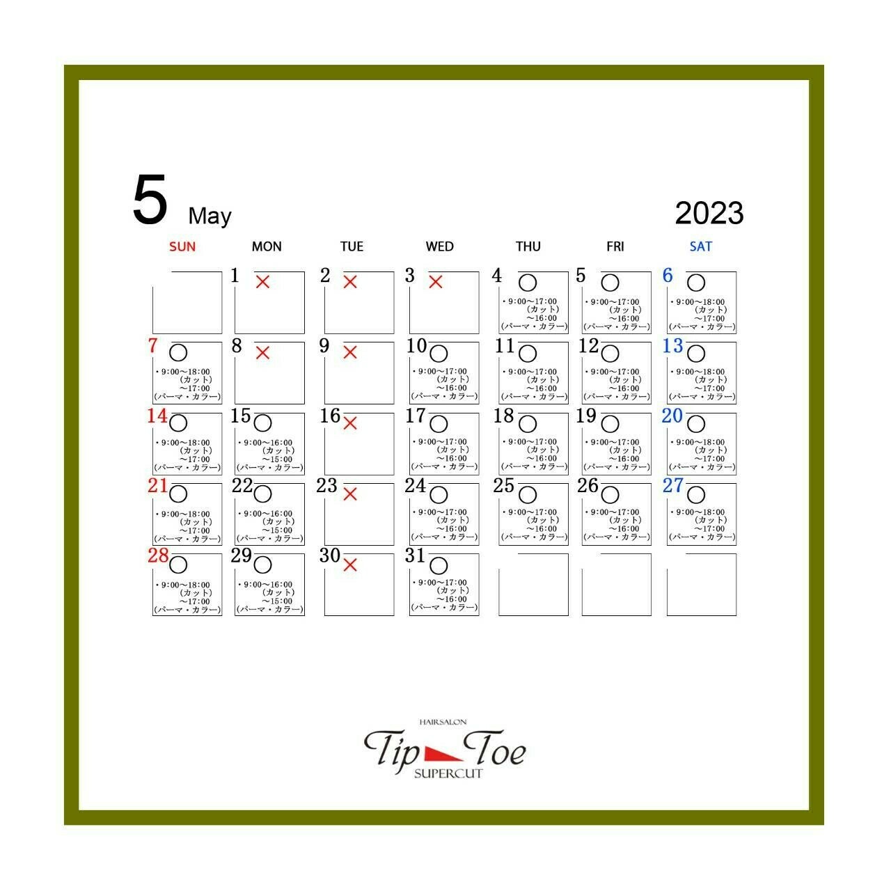 5月の定休日のお知らせ