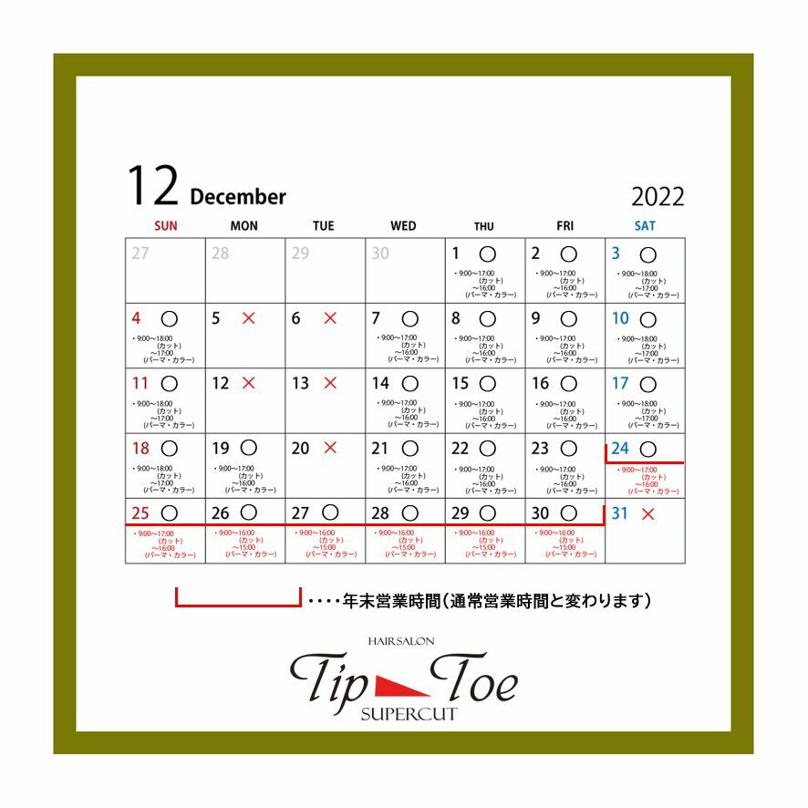 八千代台店11月 12月 年末年始 定休日のお知らせ