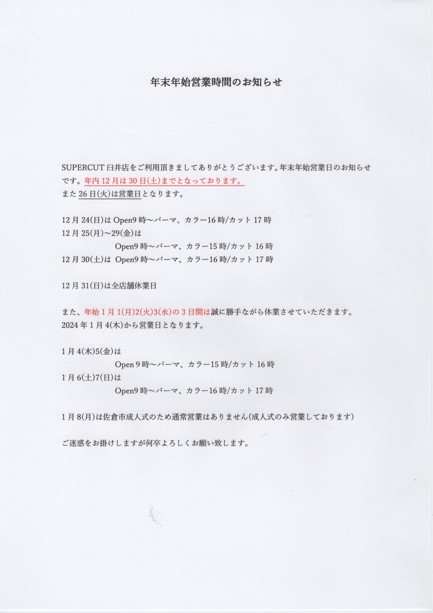SUPERCUT臼井店 年末年始営業時間のお知らせ