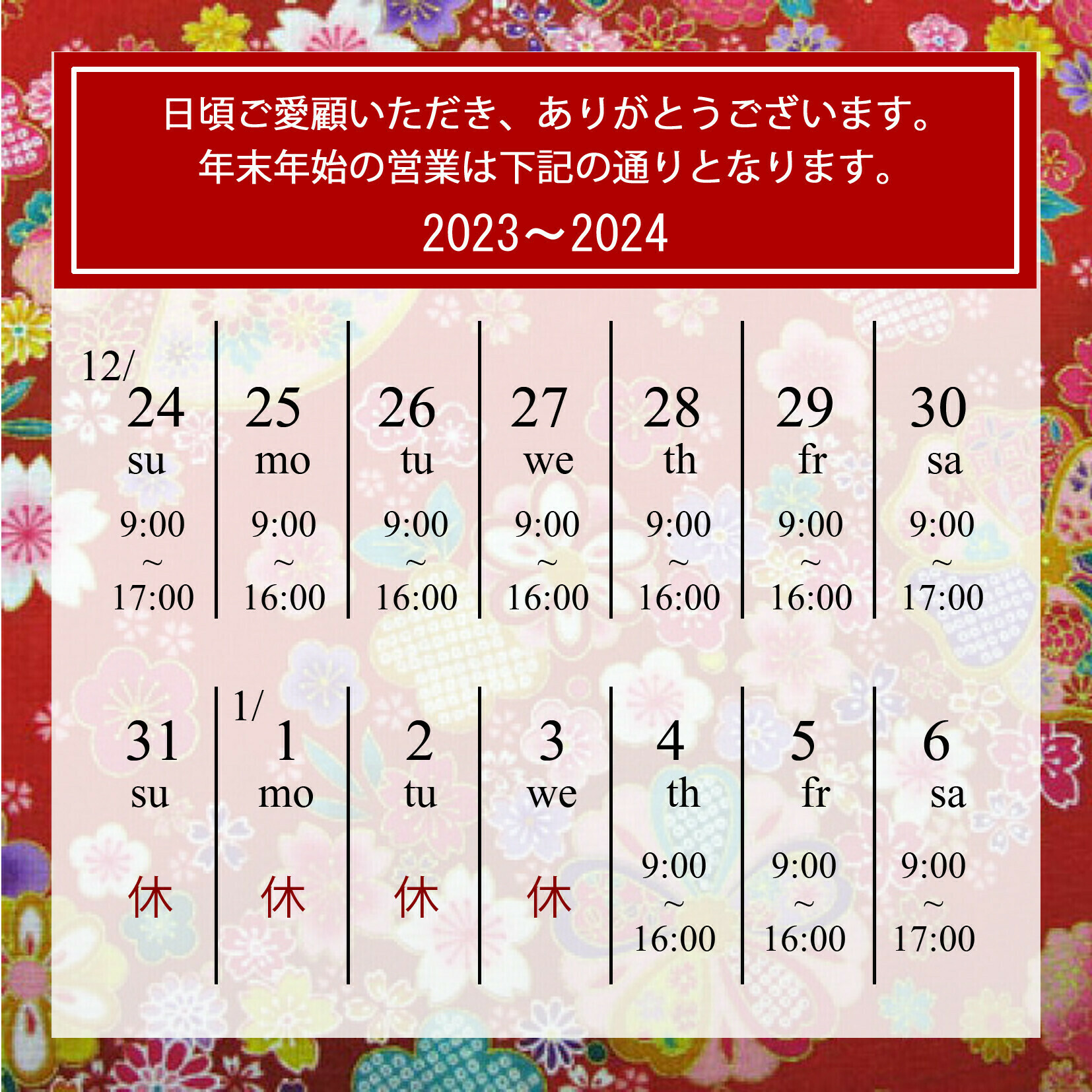 年末年始営業時間のお知らせ 2023~2024