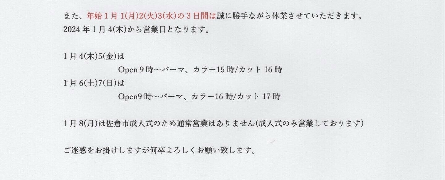 2024年が皆様にとりまして、健康で美しく笑顔で過ごせる年でありますようお祈り申し上げます。どうぞ本年も変わらぬご愛顧を賜りますようお願い申し上げます。
