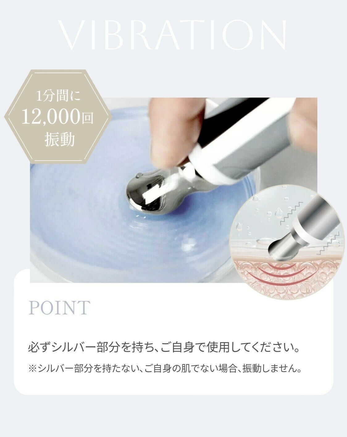 1分間に12,000回の振動を起こすことにより、角質層まで美容成分を浸透させます。振動型美顔器は、余計な力を加えずに美容成分を浸透させられるほか、マッサージ効果によって肌にハリを与えます。