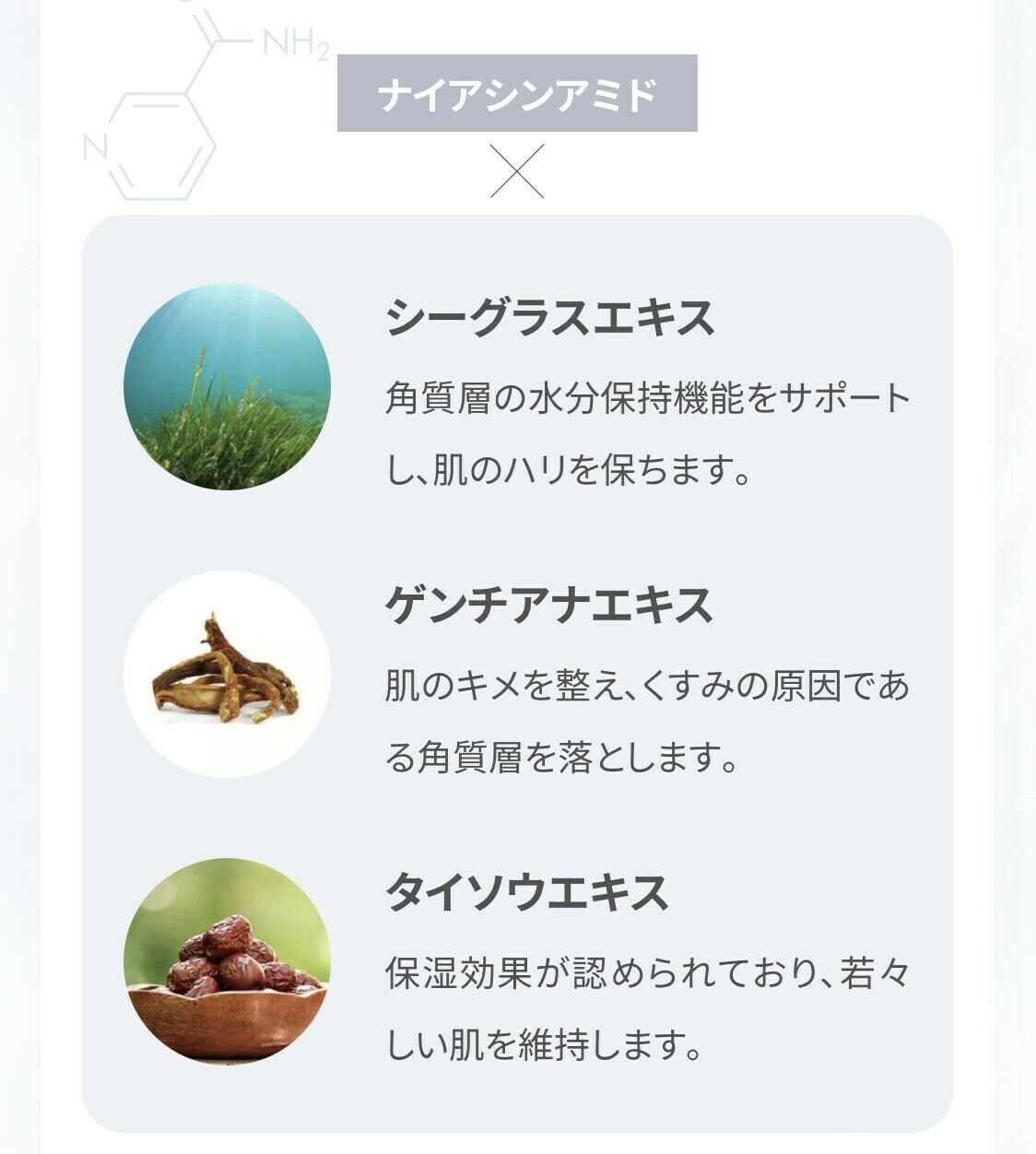 美白※シワ改善のナイアシンアミドと美白※効果のある3つの美容エキスの相乗効果により、シミとソバカスをより効果的なに予防します。