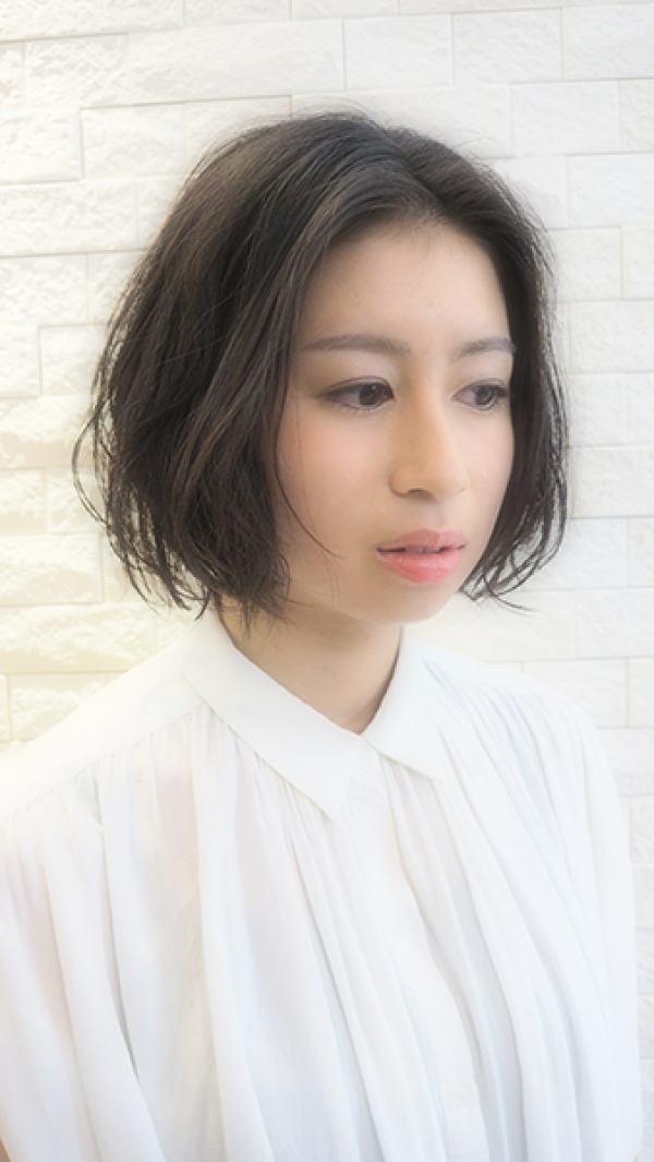 暗めの髪はパーマでふんわり感と動きをプラス。ウエットに仕上げて完成。